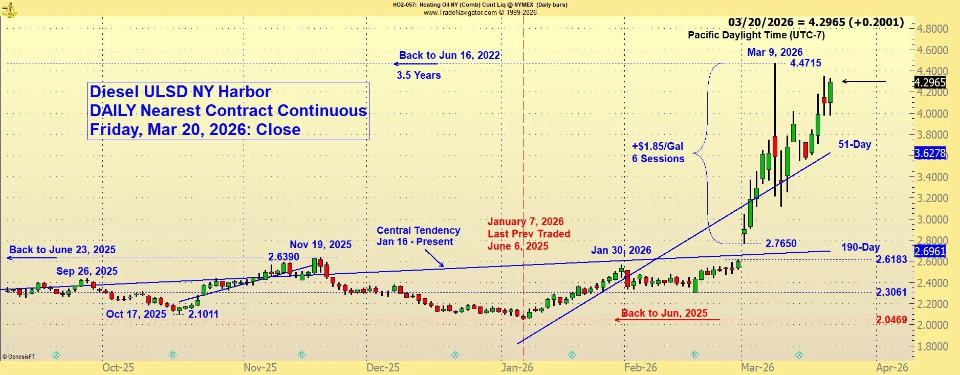 Ultra Low Sulfur Diesel (USLD) fuel contracts of 42,000 gallons delivered to New York Harbor destinations have gapped higher as a direct result of the Iranian “closure” of the Straits of Hormuz, although it is the insurance brokers that probably had more to do with halting shipping of crude oil and derivations. By reports the Iranian Navy has been crippled and most of the Iranian military capability to shoot at shipping has been disabled at this point. The diesel market’s upward spike is unlikely to end while assessment of future conditions among the oil producing nations of the Middle East continues. There are apparently discussions of protective escorts and alternative insurance guarantees sponsored by the U.S. which may help alleviate some of the pressure, but few vessel owners are likely to venture into the area until there is some proof of stability.