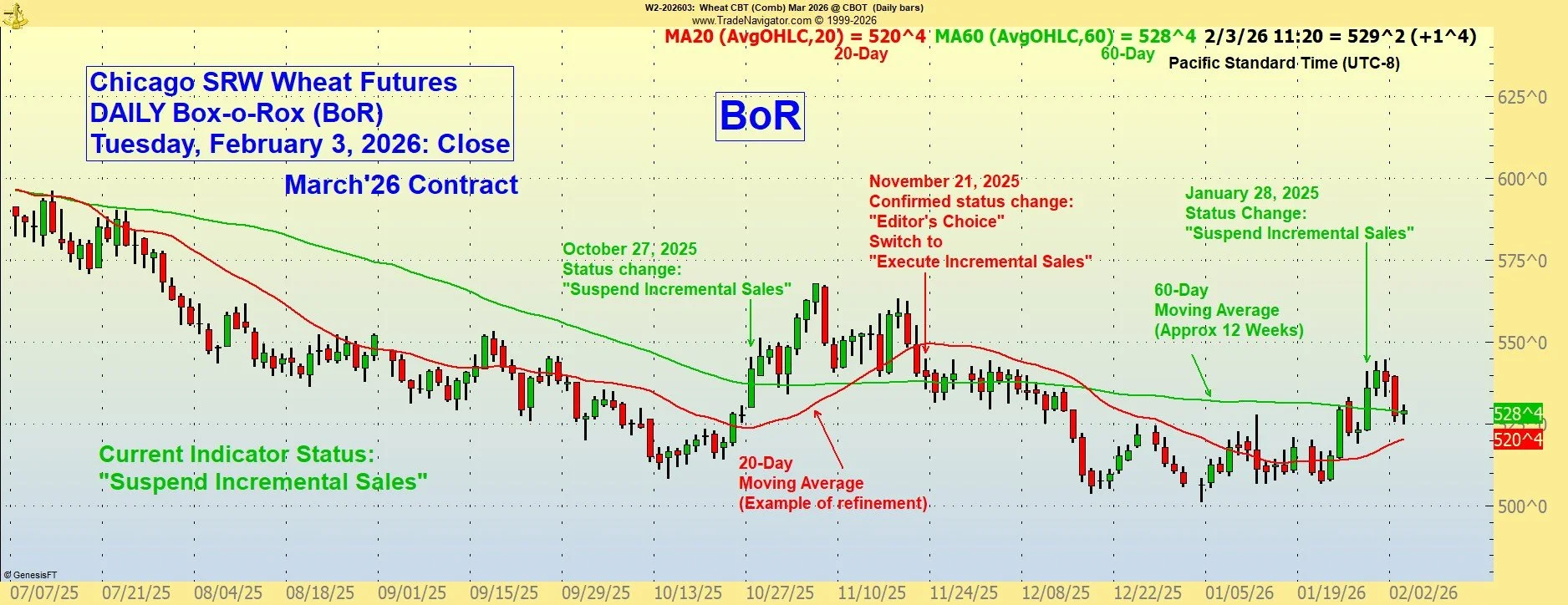 Alert: Market Bullets® Monday, January 26, 2025: Close: The Chicago March contract reached closed at the 60-day line (green), which has not been penetrated. No change in Status from “Execute Incremental Sales on Schedule”. The use of this crude indicator is not intended to be considered in isolation, or as a systematic order generator. It is for support of marketing decisions taken in a more comprehensive approach, including consulting with your merchant.