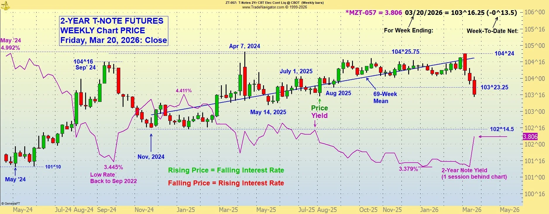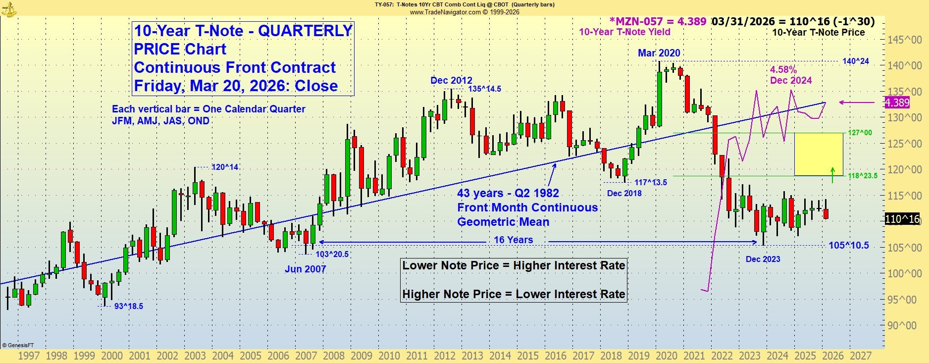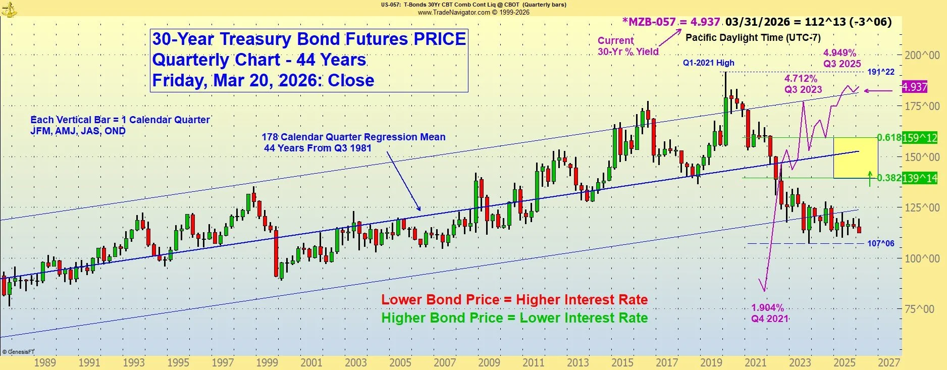 The lower the bond price moves, the higher the corresponding (long-term) interest rate. Higher bond prices indicate lower interest rates. Please call with questions. 509-337-8417