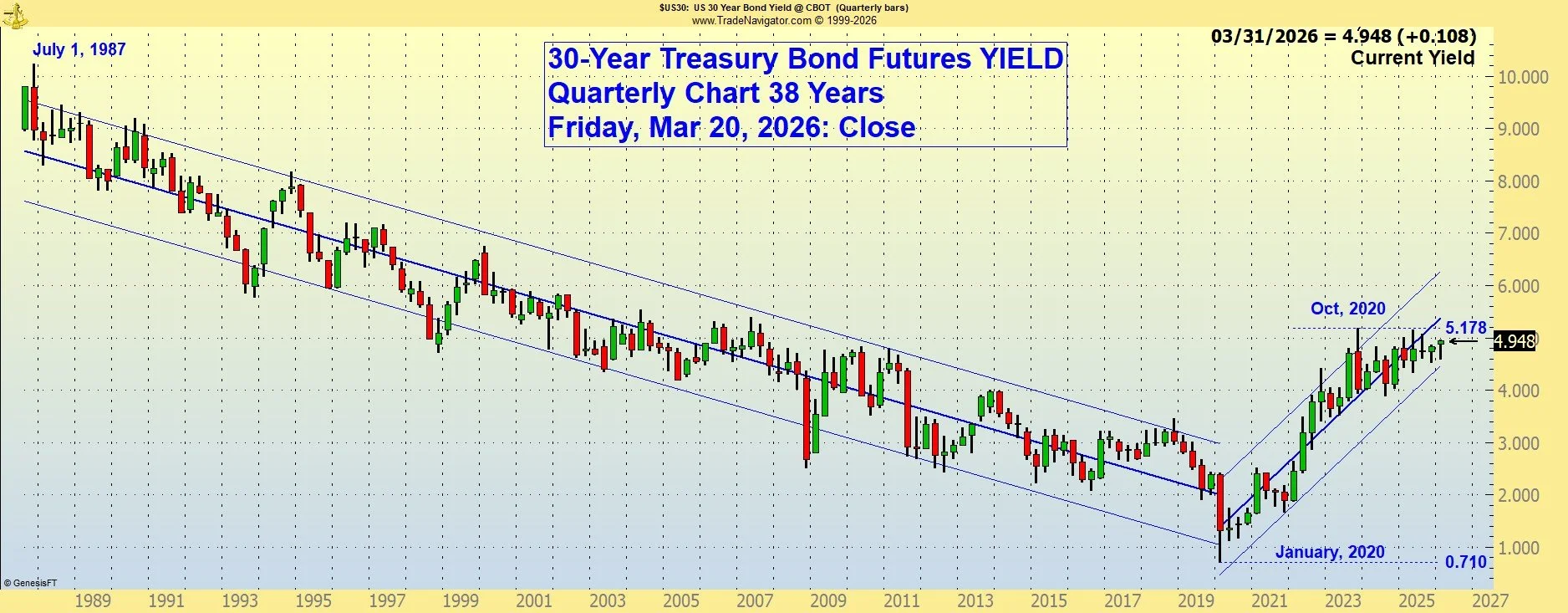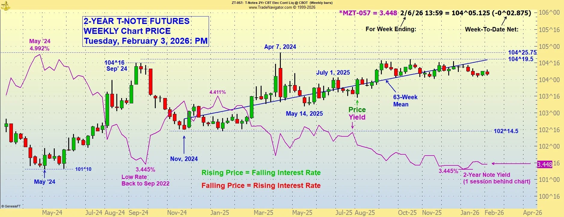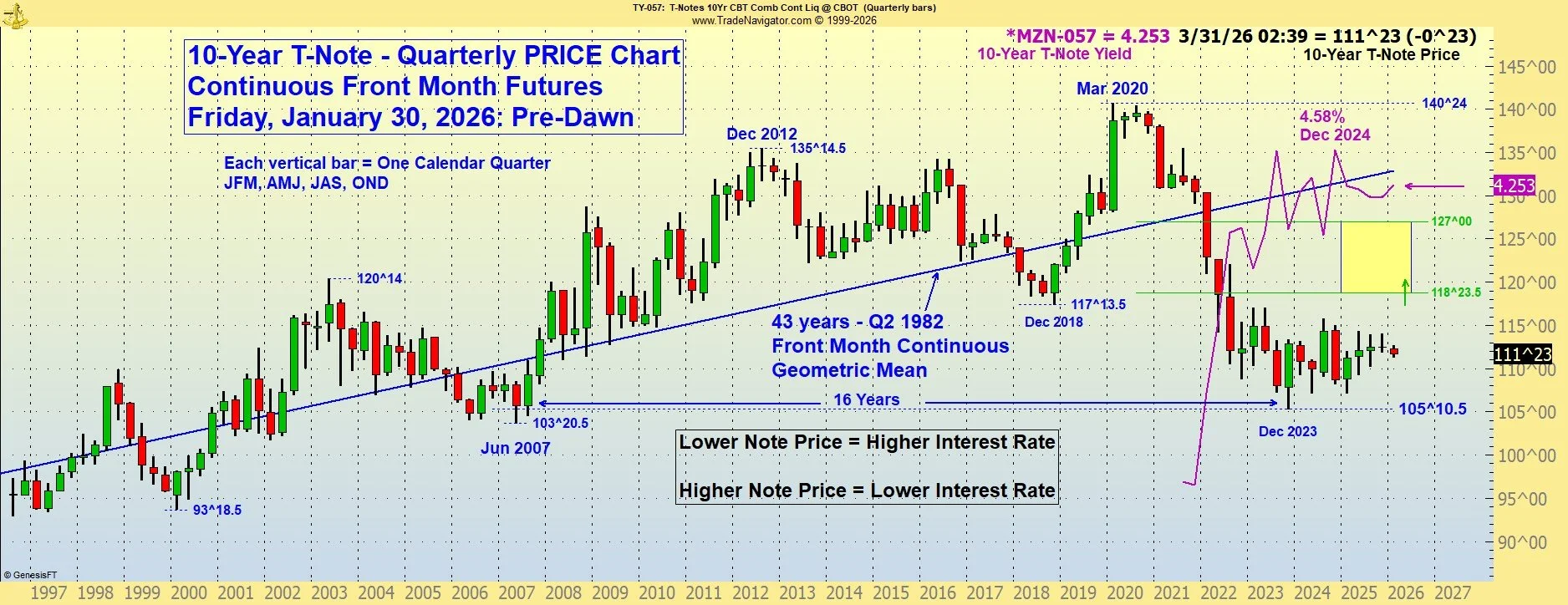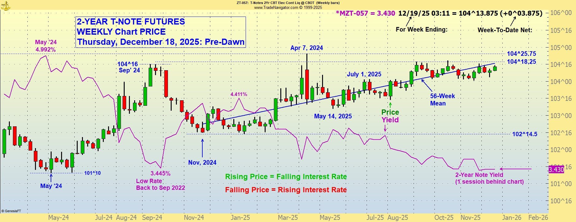 The lower the bond price moves, the higher the corresponding (long-term) interest rate. Higher bond prices indicate lower interest rates. Please call with questions. 509-337-8417