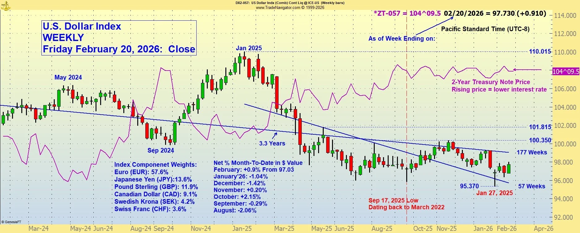 *A “Real Interest Rate” equals the observed market interest rate adjusted for the effects of inflation. The current nominal US Real Interest Rate is about +1.1%. The current rate of inflation as of February 13, 2026 is roughly 2.4%, while the yield on short-term treasury paper is from 3.4% to 3.6%. Currency flows tend to favor those that pay a positive real rate, but political and other risks are also taken into account. The long-term effect of perceived stability and safety along with positive rates is to make the U.S. dollar and/or government notes and bonds more attractive in global markets versus other currencies or paper, even of nations whose real interest rates are positive.