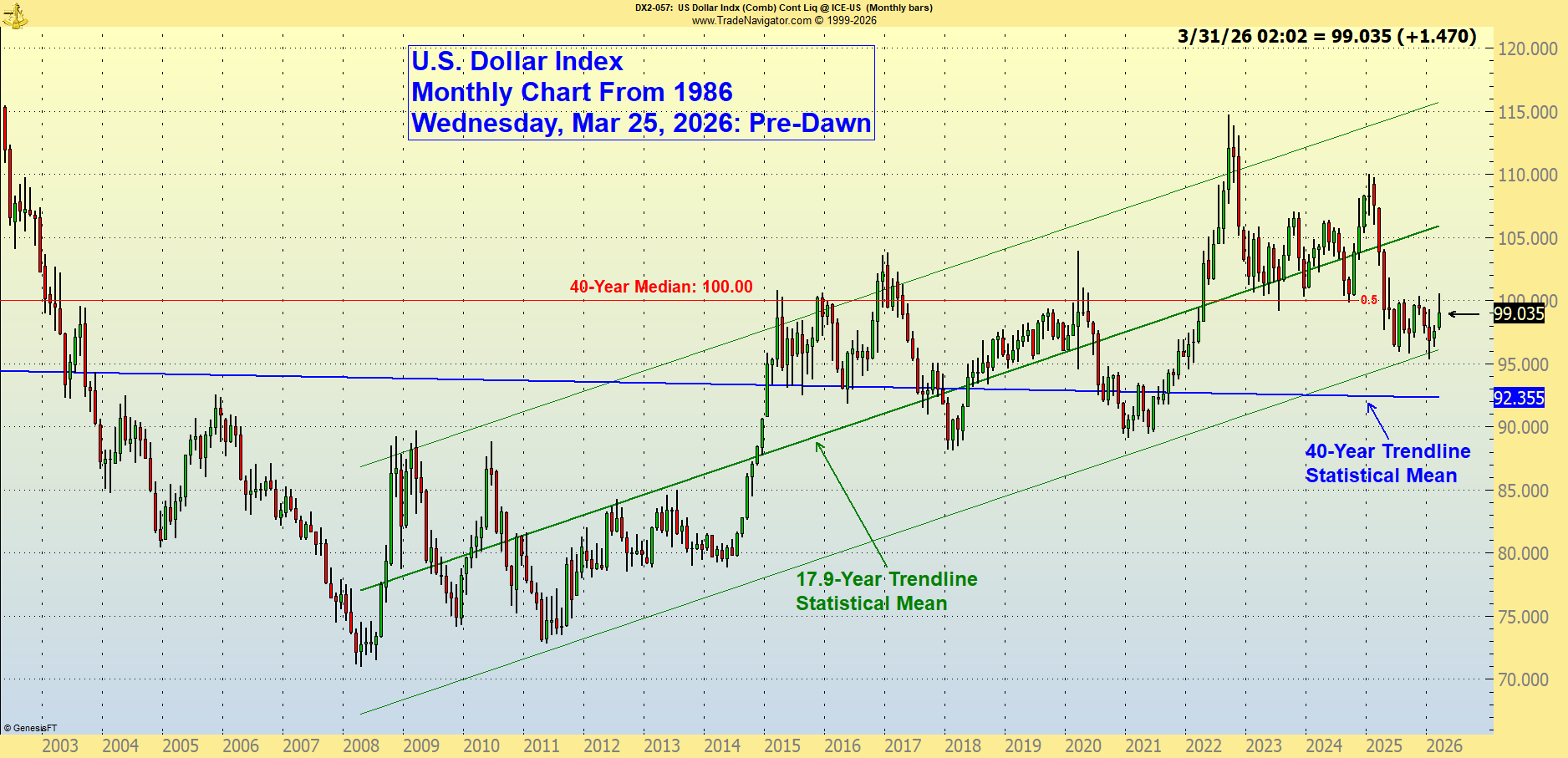 Since mid-2022, the U.S. Dollar Index has been declining, but remains within a firmly defined 17-year upward channel. The current value is trading at about the same level as early 2022, which is just above the median value of the 40-year span back to 1986. It is hyperbole to claim that the Dollar is “weak”. It is lower than it was, but near the “normal” value in a wide historical range.