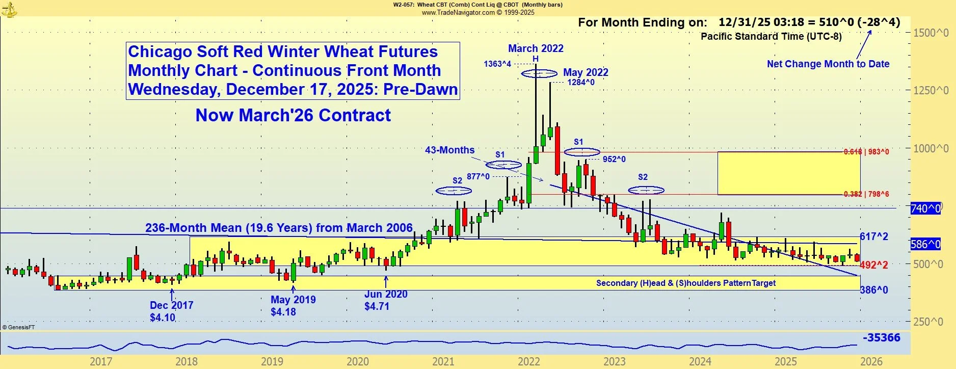 The big, multi-decade trend channel in the 56-year annual chart of Chicago Soft Red Winter (SRW) wheat is positive, although the war-driven highs of 2022 interrupted an 18-year negative retracement off of the 2008 peak (caused by a global weather-induced wheat supply shortage coupled with a weak U.S. Dollar). The market is still well within the multi-decade “normal” trend channel. To disrupt this massive, positive trendline channel on the downside, wheat would have to trade below $3.93 in the front month futures contracts. The odds of such a failure remain small, although the last 3 years of trade have eroded the cushion to less than 15 cents from the low of 2024 at $4.93, the failure of which would confirm the negative trend that lies within the multi-decade upward bias channel.