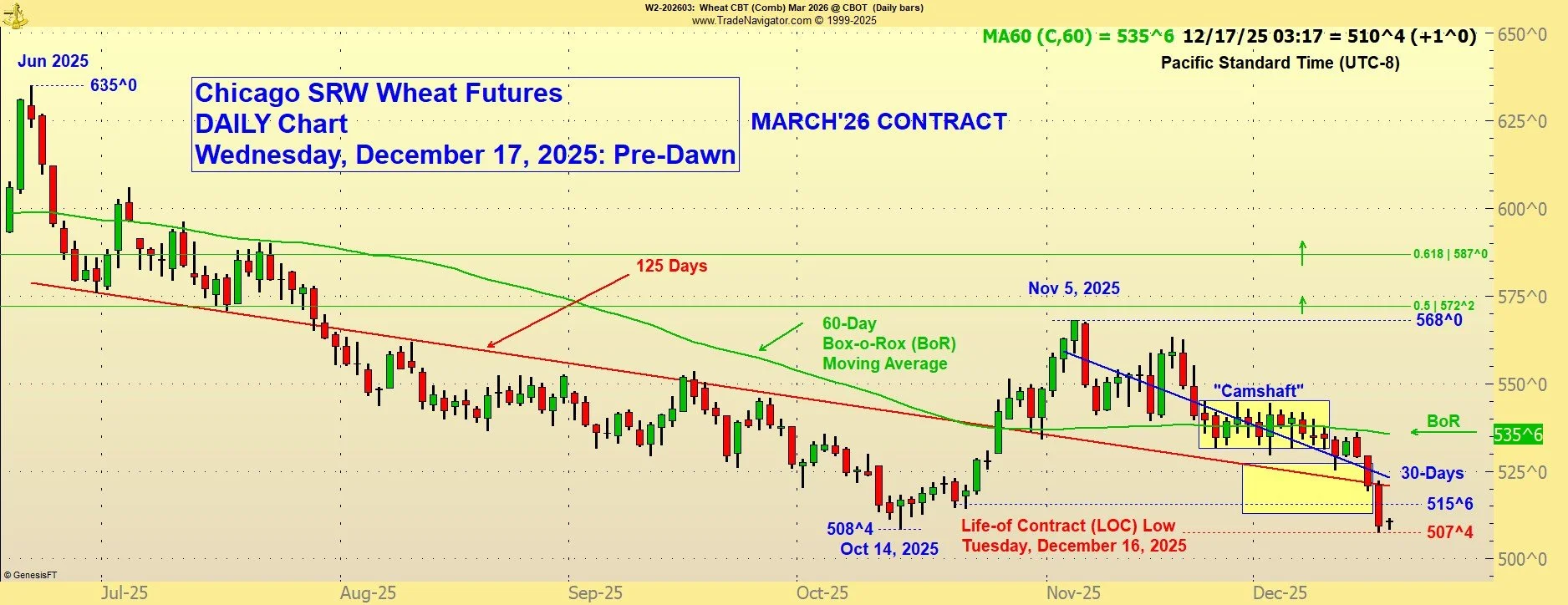 Wheat futures are playing a familiar tune – back to testing the October lows after a brief November detour. Chicago March'26 settled Monday at $5.09, barely a dime above the five-year low of $4.93¾ touched in mid-October. We're now looking at prices last seen consistently in August 2020, a lifetime ago in market terms.