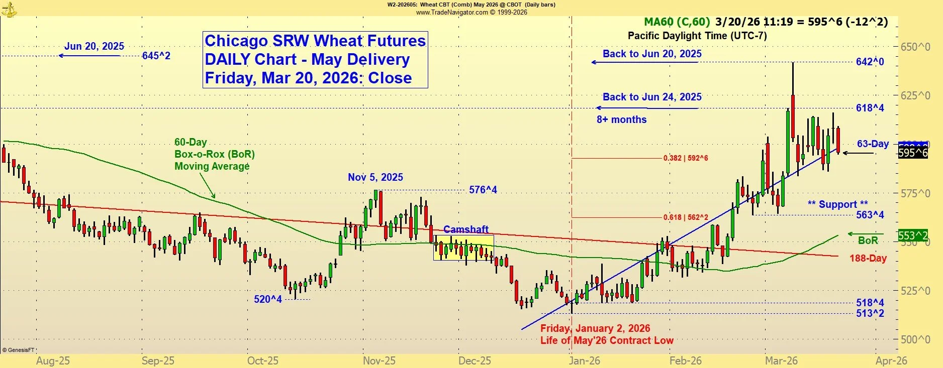 The Box-o-Rox (BoR) is still in “Suspend Incremental Sales” mode. The exit trigger level has risen to $6.00 in Chicago July futures, just 16 cents below current trading Friday morning. There is nothing wrong with reducing market exposure incrementally.